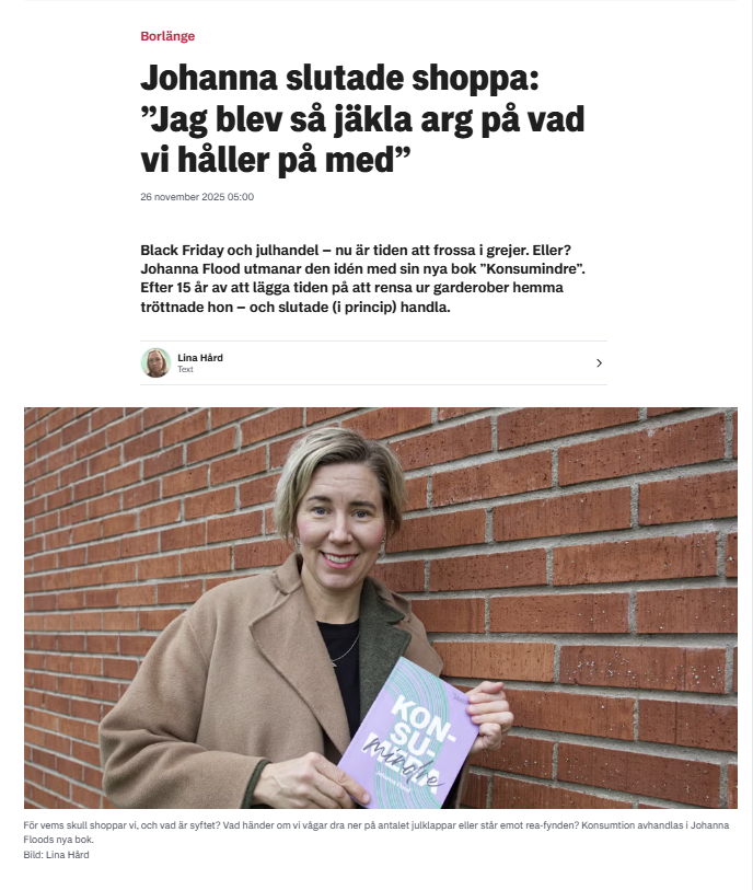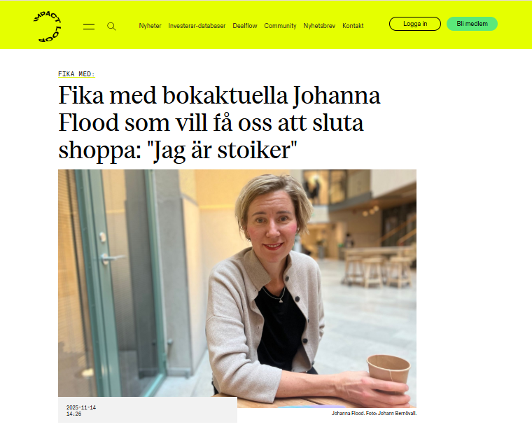 Var i Stockholm och pratade med Impactloop om överkonsumtion över en te. Fika med bokaktuella Johanna Flood som vill få oss att sluta shoppa: "Jag är stoiker" │ Impact Loop